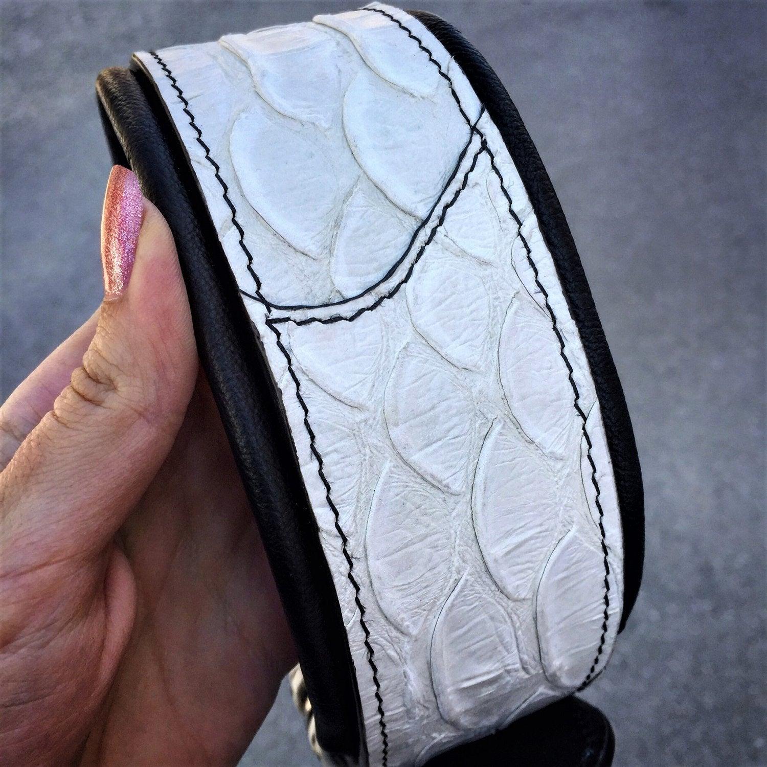 Ce collier possède un design unique fait main. Il est fabriqué en cuir de veau embossé exclusif. La couche intérieure est notre coussinet en cuir doux unique de couleur noire.