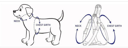 Not sure what size harness your dog needs? Please measure from the base of your pet's neck leaving enough space for two fingers. The harness sits a bit lower than their collar. The chest measurement should be taken around the widest part, just behind the front legs. If you’re at the end of a measurement, we recommend you size up.