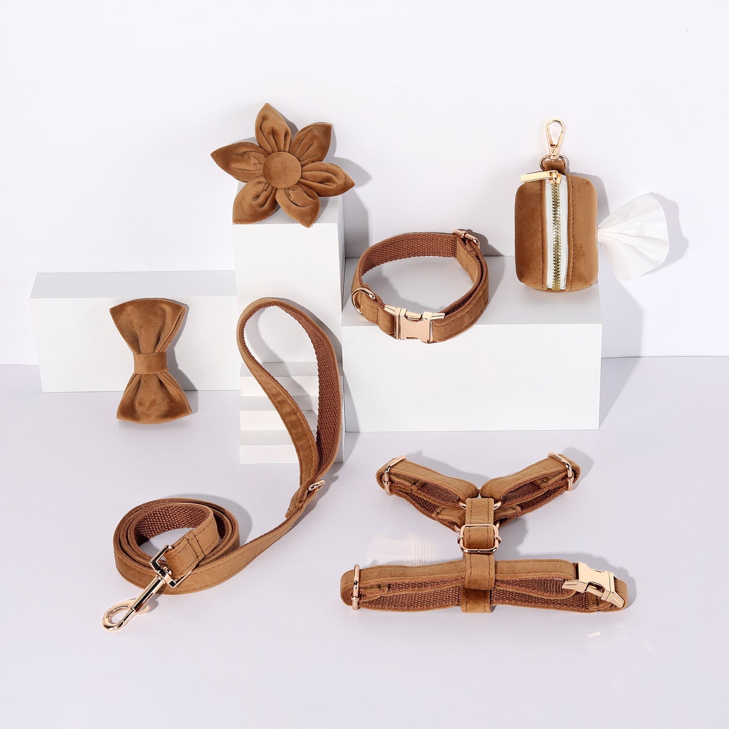 The set includes matching Step In Harness,Waste Bag Holder,Leashes,Bowtie and Collar.